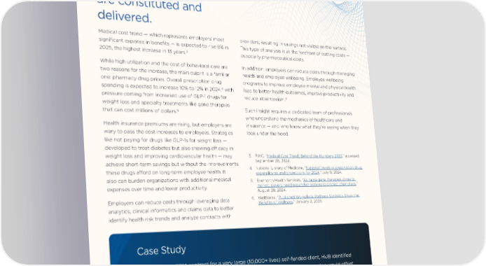 Affordability Sustainability Cost pressures will require rethinking how health insurance plans are constituted and delivered. Medical cost trend — which represents employers’ most providers, resulting in savings not visible on the surface. significant expense in benefits — is expected to rise 8% in This type of analysis is at the forefront of cutting costs — 2025, the highest increase in 13 years.3 especially pharmaceutical costs. While high utilization and the cost of behavioral care are In addition, employers can reduce costs through managing two reasons for the increase, the main culprit is a familiar health and employee wellbeing. Employee wellbeing one: pharmacy drug prices. Overall prescription drug programs to improve employee mental and physical health spending is expected to increase 10% to 12% in 2024,4 with lead to better health outcomes, improve productivity and pressure coming from increased use of GLP-1 drugs for 6 reduce absenteeism. weight loss and specialty treatments like gene therapies that can cost millions of dollars.5 Such insight requires a dedicated team of professionals who understand the mechanics of healthcare and Health insurance premiums are rising, but employers are insurance — and who know what they’re seeing when they wary to pass the cost increases to employees. Strategies look under the hood. like not paying for drugs like GLP-1s for weight loss — developed to treat diabetes but also showing efÏcacy in weight loss and improving cardiovascular health — may 3. PWC, “Medical Cost Trend: Behind the Numbers 2025,” accessed achieve short-term savings but without the improvements September 20, 2024. these drugs afford on long-term employee health. It 4. National Library of Medicine, “National trends in prescription drug expenditures and projections for 2024,” July 8, 2024. also can burden organizations with additional medical 5. Evernorth Health Services, “As more gene therapies come to expenses over time and lower productivity. market, payers need expanded options to protect their plans,” August 28, 2024. Employers can reduce costs through leveraging data 6. WellSteps, “Published Workplace Wellness Statistics Show the Benefits of Wellness,” January 2, 2020. analytics, clinical informatics and claims data to better identify health risk trends and analyze contracts with Case Study In reviewing a PBM contract for a very large (10,000+ lives) self-funded client, HUB identified two component-level guarantee stipulations under which missing one guarantee would offset the other. HUB and the client adjusted the contract so that both had to be covered — and when one of the guarantees was subsequently missed, the client received a $750,000 financial guarantee payout. 3