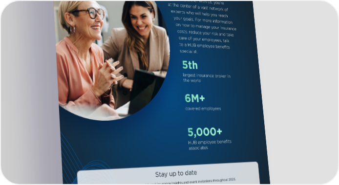 HUB Employee Benefits When you partner with us, you’re at the center of a vast network of experts who will help you reach your goals. For more information on how to manage your insurance costs, reduce your risk and take care of your employees, talk to a HUB employee benefits specialist. 5th largest insurance broker in the world 6M+ covered employees 5,000+ HUB employee benefits associates Stay up to date Subscribe to receive risk and insurance insights and event invitations throughout 2025. Subscribe hubinternational.com